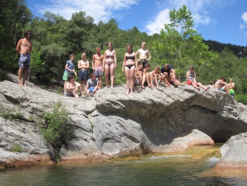 Nach 19 Stunden Busfahrt kamen wir ein wenig übermüdet in unserem ersten Camp in den Pyrenäen an. Zunächst wurden unsere Koffer und weitere Gepäckstücke von Voyage – Mitarbeitern eingesammelt und zum Camp gebracht. Wir konnten uns direkt ein wenig sportlich betätigen und zum Camp laufen, was angesichts des galaktischen Wetters eine willkommene Aktivität darstellte. Dort warteten bereits weitere Mitarbeiter, die uns die Zelte und das Gelände vorstellten. Nach der Zeltbelegung stand die erste Stärkung in Form eines reichhaltigen Frühstücksbuffets an. Neben Brötchen und Müsli standen auch Milchreis und frisches Obst bereit. Im Anschluss wurden alle Teilnehmer in Kleingruppen eingeteilt. In diesen fanden eine kurze Regelbesprechung und ein Rundgang über den angrenzenden Campingplatz statt. Anschließend wurden der Pool und die Badestelle des angrenzenden Flusses Muga eingeweiht bevor gegen Nachmittag Kennlernspiele auf dem Programm standen.