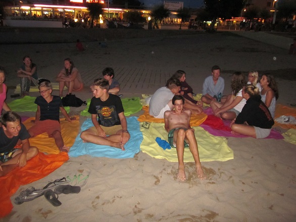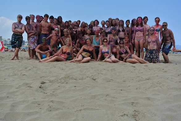 Dieser letzte Tag in Spanien stand unter dem Motto „Farben“. Er begann mit einem bunten Mix verschiedener Spiele, die in den Super Klein Gruppen vorbereitet und durchgeführt wurden. Diesmal übernahmen die Teilnehmer das Kommando und die Betreuer wechselten in die Teilnehmerrolle. Zunächst wurde der JOTO - Strandabschnitt zu einem regelrechten „Schlachtfeld“. Beim Spiel „Capture the flag“ traten zwei Gruppen gegeneinander an, die zunächst ihren jeweiligen Strandabschnitt präparierten. Es wurden tiefe Gräben gegraben und Schutzwände errichtet. Danach „bewaffnete“ sich jeder Teilnehmer mit einer Wasserbombe. Ziel war es, in das andere Lager einzudringen, ohne von einer Wasserbombe des Gegners getroffen zu werden und die gegnerische Flagge zu erobern und in das eigene Lager zu bringen. Bei über 30 Grad war dies so oder so eine hitzige Angelegenheit, sodass sich alle über ein wenig Abkühlung beim zweiten Spiel freuten. Beim Wasserball traten zwei Mädchen- und Jungenmannschaften gegeneinander an und versuchten jeweils den Ball in das gegnerische Tor (zwei selbstgebaute Bojen) zu transportieren. Anschließend ging es wieder am Strand zur Sache: Beim Brennballturnier mussten sowohl Schnelligkeit als auch Wurfkraft unter Beweis gestellt werden. Nach einem ebenfalls recht engagierten Battle konnten sich die Teilnehmer entspannt auf ihre Decken fläzen, denn nun waren die Betreuer beim Improvisationstheater gefragt. Sie nahmen bestimmte Rollen ein und mussten sich in ihrer fiktiven WG heißen Diskussionen hingeben.